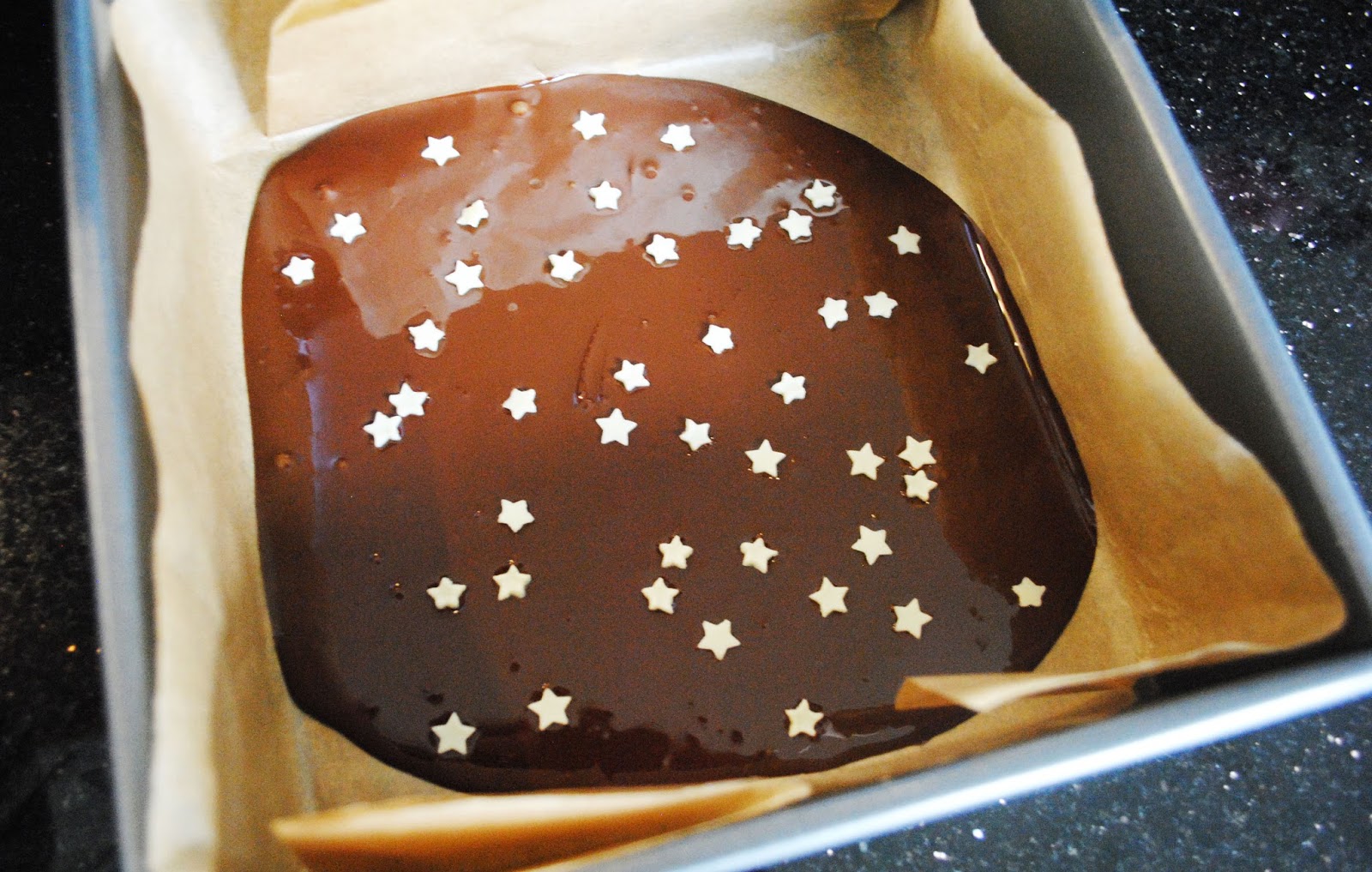 While your cake is in the oven you can get on with making the shards which will decorate the top of the cake. For the chocolate ones, break up one whole bar of dark chocolate into a bowl and melt in the microwave. Grab a square/rectangle baking tray or tin and line with greaseproof paper. Pour the melted chocolate into the tin and sprinkle with stars. Then place in the fridge/freezer until you are ready to decorate.